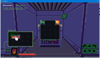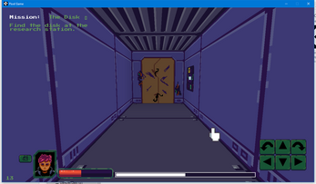 This is a first-person turn-based dungeon crawler with pixel graphics and a sci-fi setting.